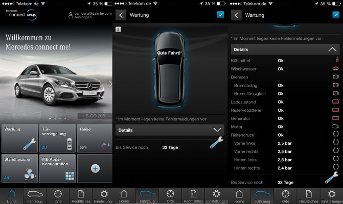 Der besondere Clou an der Mercedes „connect me“ Lösung ist, dass es dem Fahrer bzw. Nutzer völlig frei gestellt wird ob er mit einem Apple oder Android Smartphone auf diese Informationen zugreift, oder gar einen Tablet-Rechner oder klassischen Computer nutzt. Es handelt sich hierbei um keine App sondern vielmehr um eine Webseite. Clever gemacht und so auch immer spielend auf dem letzten Stand darstellbar Seitens Daimler.