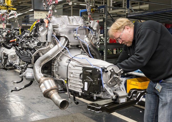 Nachdem der Motor mit dem AMG MCT Getriebe verbunden wurde, wird der Antriebsstrang weiter komplettiert und dann als so genannte Hochzeit mit der parallel hierzu gefertigten Karosserie vereint.